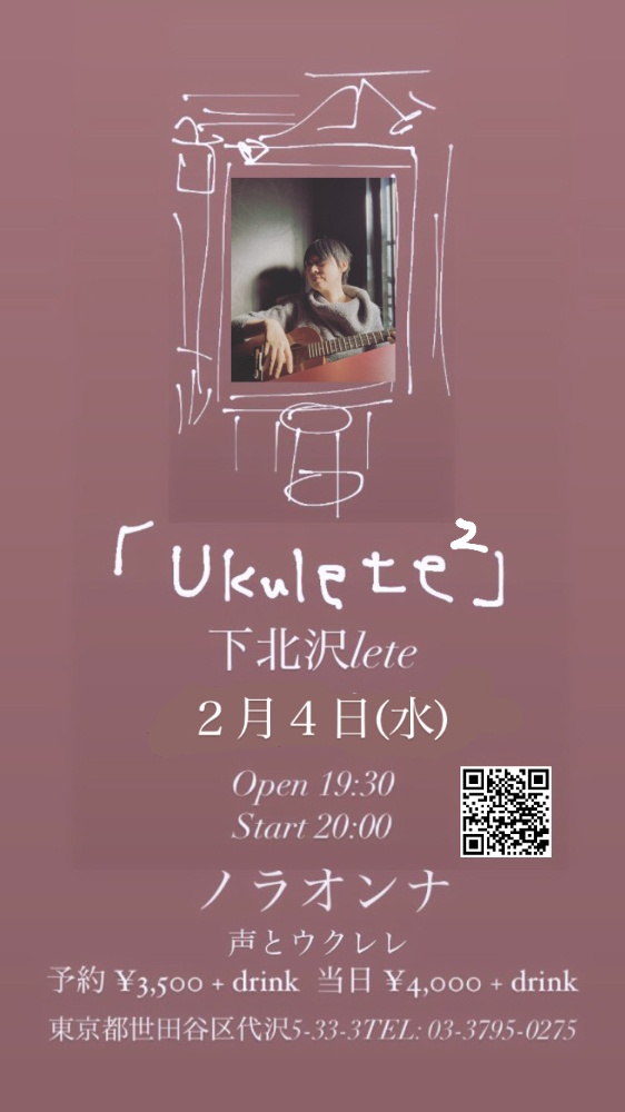 「ukulete2」2026年2月4日(水)出演ノラオンナ(声とウクレレ)下北沢lete東京都世田谷区代沢5-33-3TEL: 03-3795-0275https://l-ete.jp/*Open 19:30Start 20:00予約 ¥3,500 + drink 当日 ¥4,000 + drink予約受付1/4よりレテまたは下記予約フォームから